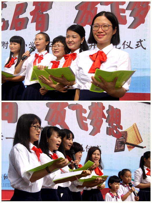 “老师,为什么您的眼睛总是闪闪发光?孩子,因为老师看到,你们是祖国的未来,民族的希望。老师,为什么您的脚步总是那么匆忙?孩子,因为我们要为你快速的成长播撒阳光。老师,您为了什么?孩子,因为我们是老师!没有华丽的舞台,没有簇拥的鲜花,唯有三尺讲台无怨无悔。”一年级部分任课教师向大家展示《教师礼赞》。