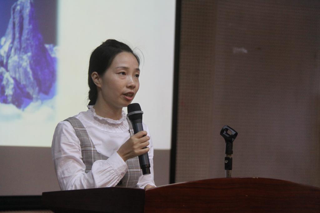 中学教学处主任胡琴代表中学参赛老师以《低头做事,抬头看路》为主题,通过以教材分析、学情分析、教学目标、教学重难点、教学方法到教学过程等分析赛程的各个环节,在解读评分标准的基础上,着重指出老师们的课堂要有先进的教学理念与科学理论支撑。她认为建构主义理论是提倡在教师指导下,以学习者为中心的学习。这既强调学习者的认知主体作用,又不忽视教师的指导作用,教师是意义建构的帮助者、促进者,而不是知识的传授者与灌输者。