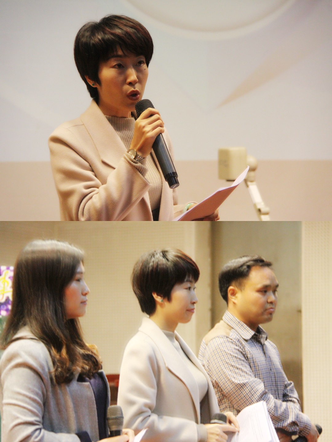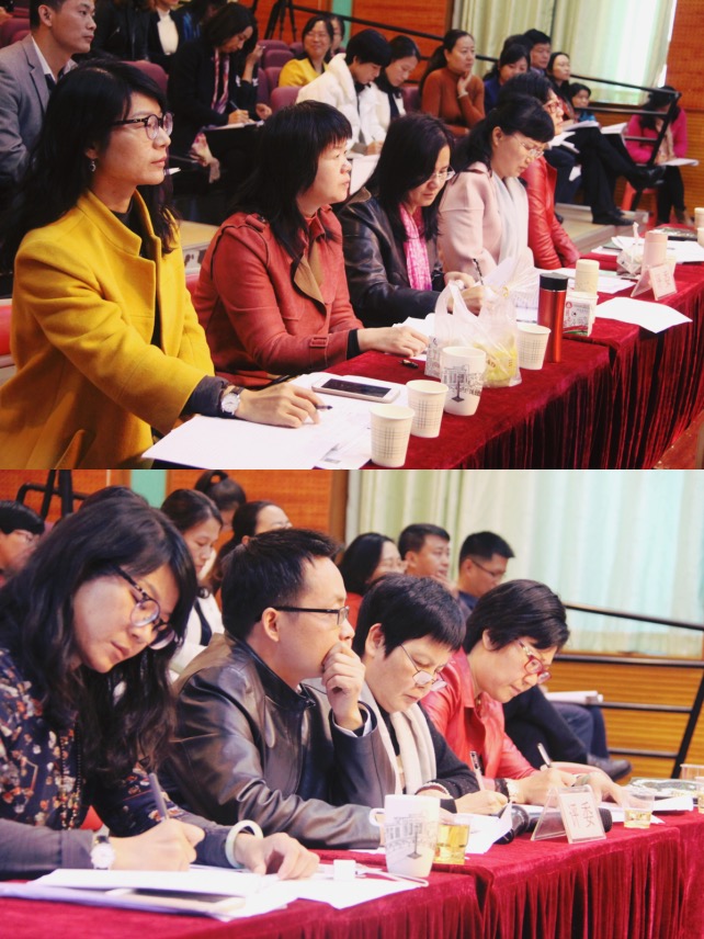 稍后,全体老师齐聚礼堂,4名教研组长分别做了背景分析、主题确定、主题开展、效果总结和反思改进的科组教研主题汇报。接着,各答辩小组团结一心,沉着机智地应答评委老师们独到的问题。最后在评委们精妙、睿智的点评中结束了上午的比赛。