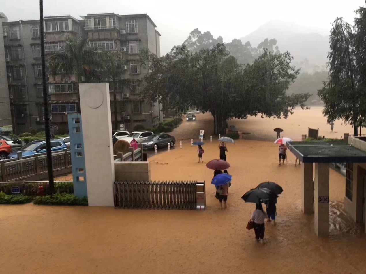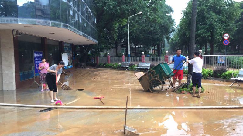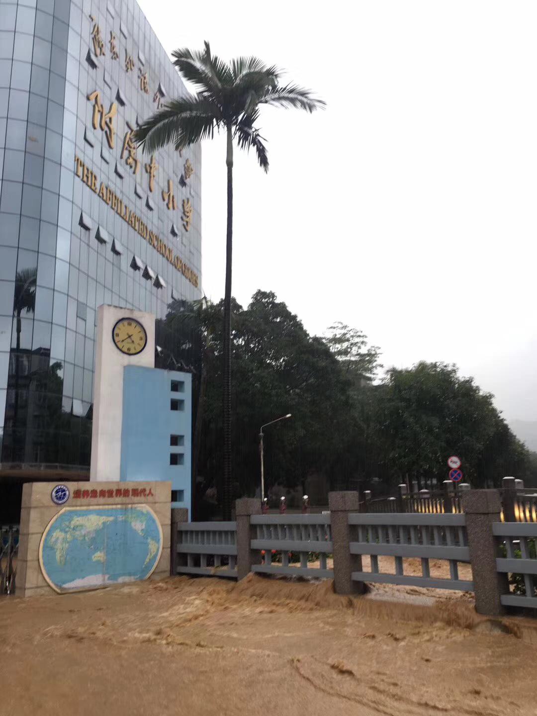 本网讯 2018年6月8日下午14:00开始,受台风“艾云尼”影响,一场突如其来的特大暴雨袭击了整个广州市。暴雨肆虐达数小时之久,白云山多处塌方,云溪河水暴涨。广外附属中小学处于山脚低洼地带,洪水夹杂着大量泥沙快速入侵校园。下午4时许,水位急速上涨,学校瞬间变成一片泽国,内外操场、一楼教室、校史室、礼堂等泥水约深50厘米,学生的出行安全和学校财产受到严重威胁,学校直接经济损失近20万元。