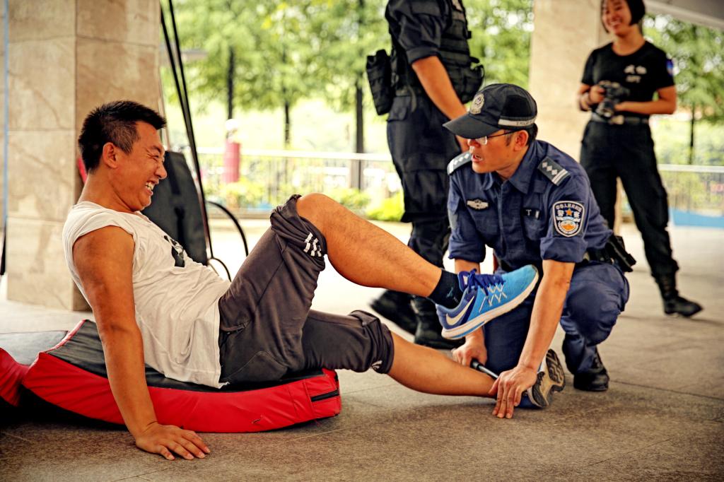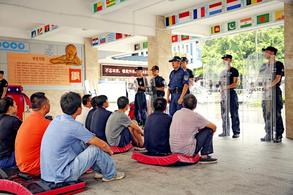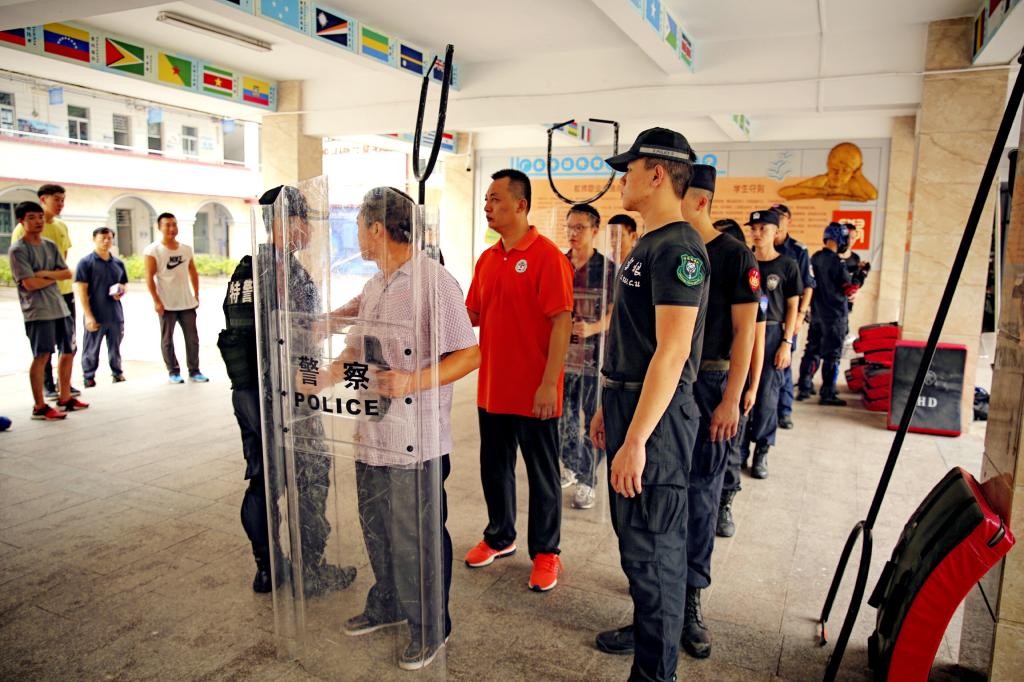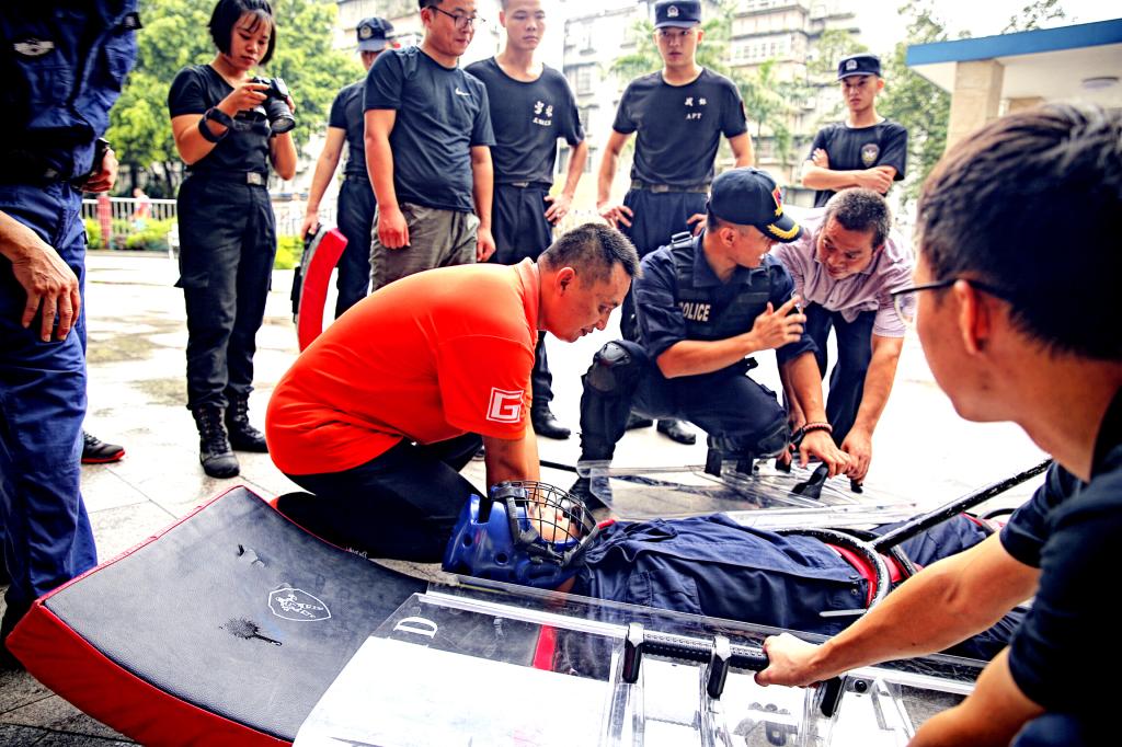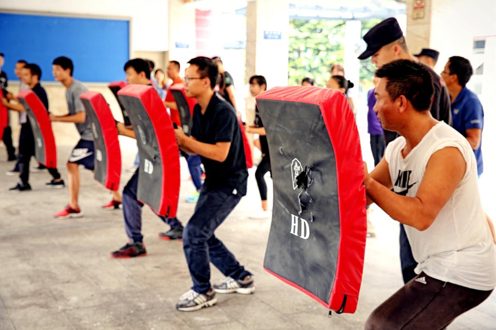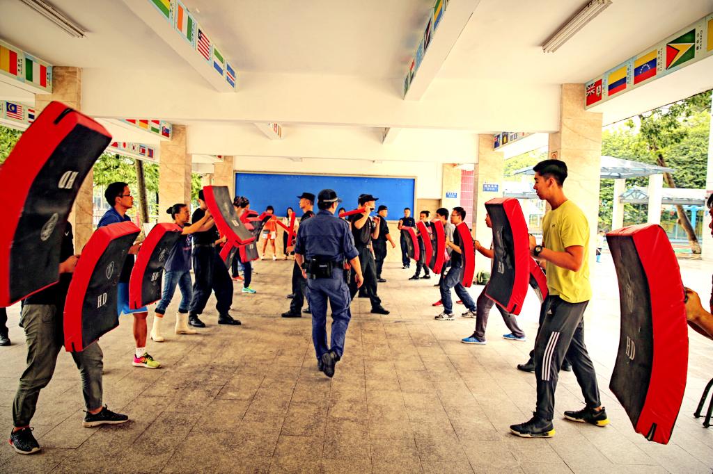 下午,我校由体育教师和后勤人员组建的教职工校园护卫队跟随广东警官学院的教官们进行防恐防暴技能训练。黄教授逐一向队员们介绍了护盾,钢叉的使用原则与技巧。现场由战术协会的警官们将队员们分成小组,进行每个技能的一对一学习与训练。通过一下午的认真学习,我校护卫队成员学习到了一整套的擒拿治敌策略。