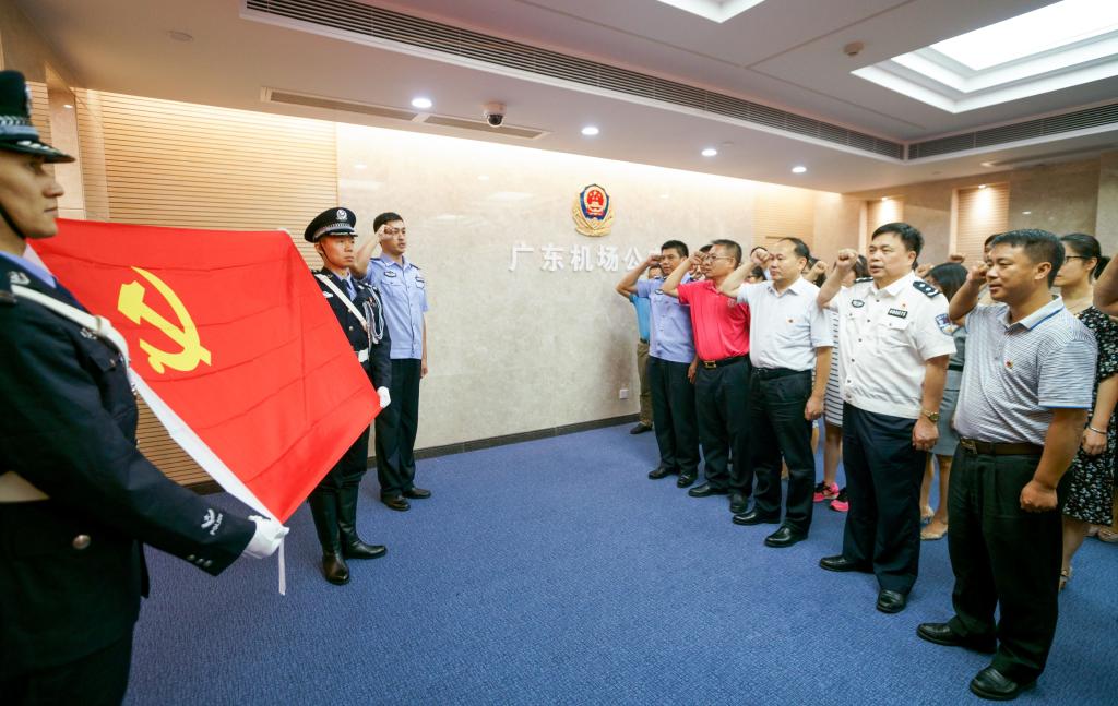 最后,参加活动的全体党员面对党旗,再一次重温入党誓词。本次活动,广东省公安厅机场公安局认真部署,细化方案,丰富内容,创新形式,确保活动有内容、有特点、有效果。学校党支部党员、入党积极分子积极参与,提高了党员先锋模范作用的自觉性,增强了基层党组织的凝聚力和战斗力。双方党支部负责人均表示,此次共建活动丰富了党员的学习教育形式,党员们受益匪浅,真正达到相互学习、相互促进、共同提高的目的,取得了预期效果。