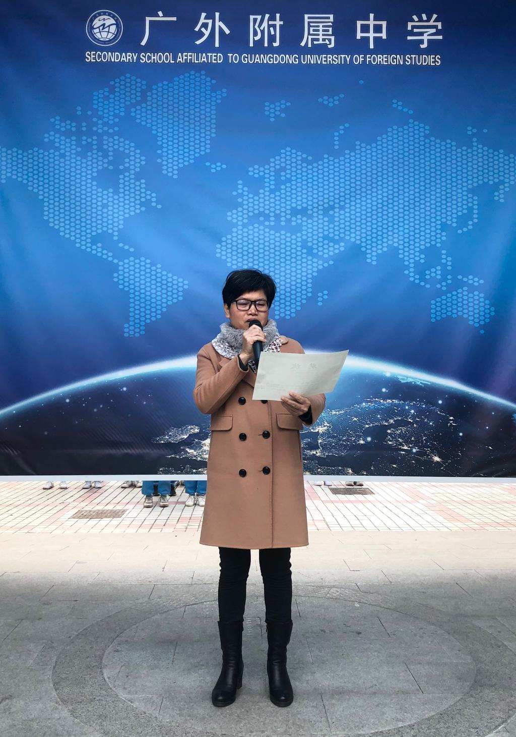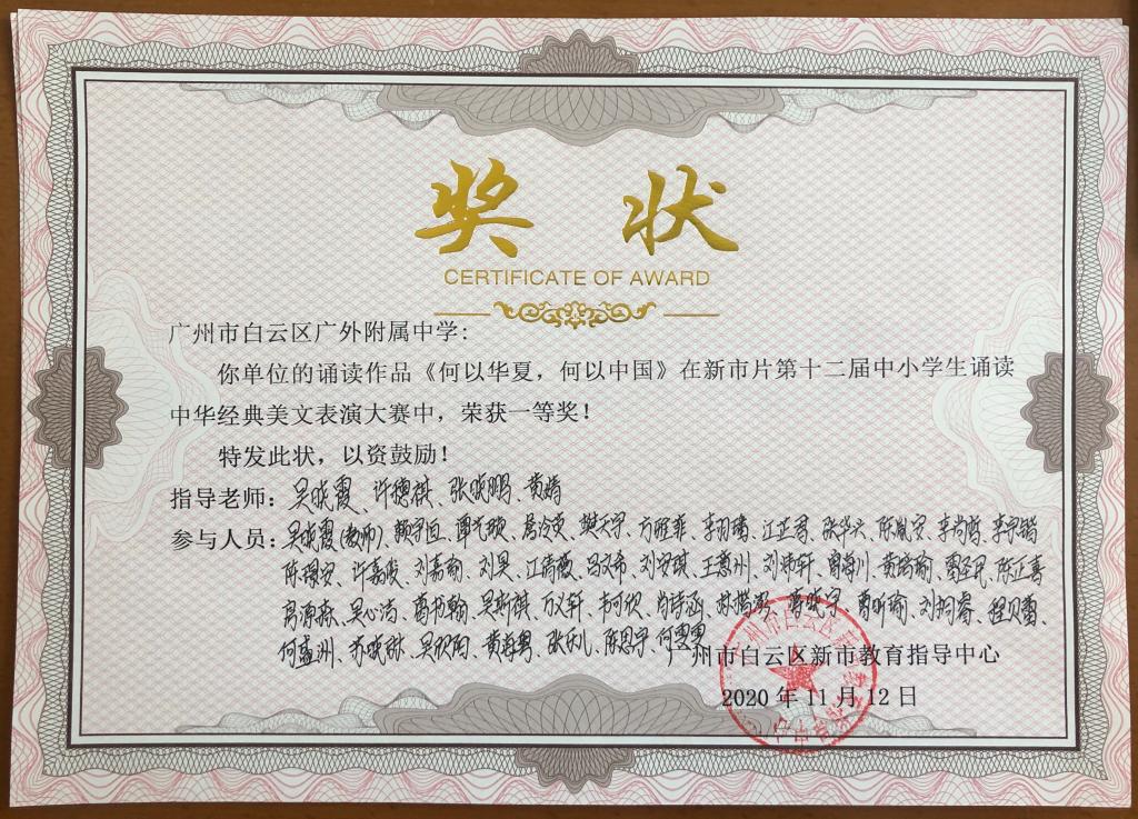 初一三班的诵读作品《何以华夏,何以中国》在新市片第十二届中小学生诵读经典美文表演大赛中,荣获中学组一等奖。林旭丽主任宣读获奖名单,袁宇迪副校长为获奖班级颁发奖状。