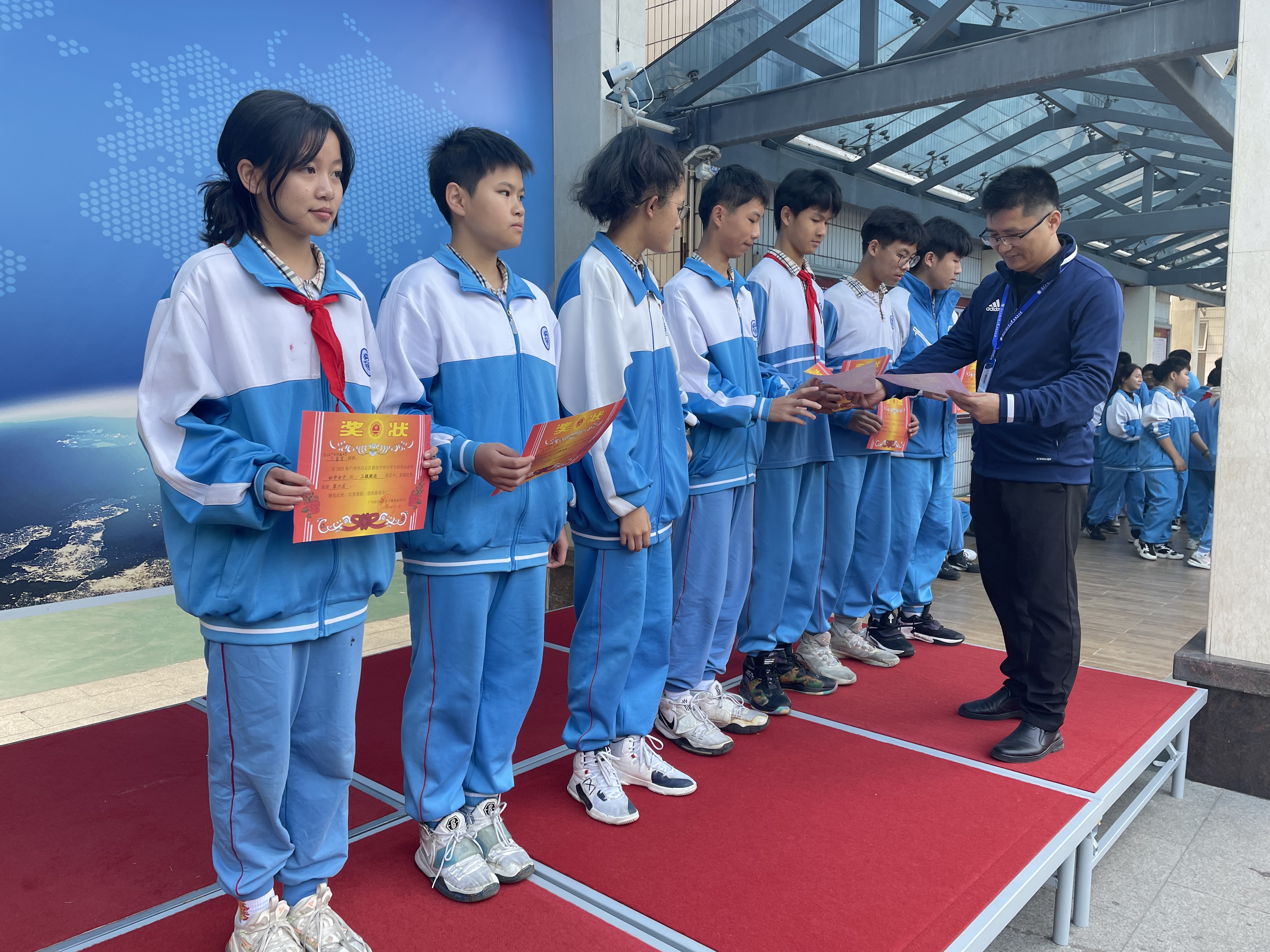 四、颁发体育类奖项。林伟忠老师宣读获奖名单,方建军校长、袁宇迪副校长、王琪副主任为获奖同学颁发奖项。