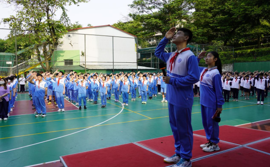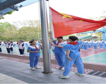 在全体师生的注视下,国旗护卫队的同学们迈着整齐划一、铿锵有力的步伐护送五星红旗入场。伴随着《义勇军进行曲》庄严的旋律,五星红旗冉冉升起,在清晨的校园迎风飘扬。