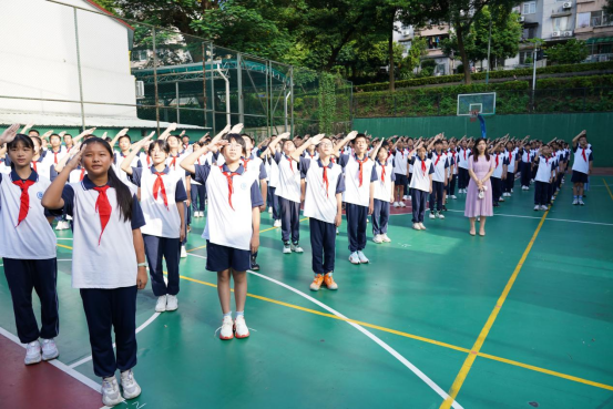 首先,我们迎来的是升旗仪式。国旗队队员英姿飒爽,他们踏着坚定有力的步伐护送国旗。伴随着庄严的国歌声,五星红旗冉冉升