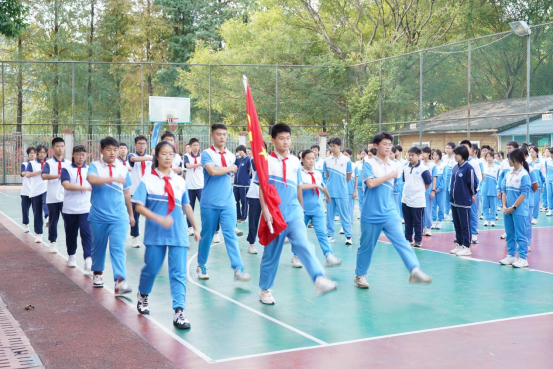 国旗队迈着整齐有力的步伐进场,伴随着庄严的国歌,五星红旗冉冉升起,全体师生行注目礼,心中满怀自豪与敬畏。