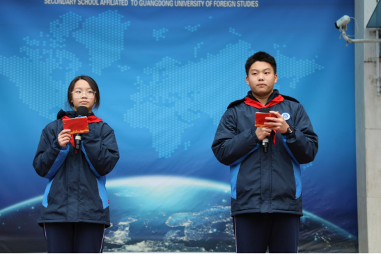 “初看春花红,转眼已成冬",时光匆匆,不知不觉冬至即将来临。一年一度的冬至是中华传统节日,是我国传统文化中的重要组成部分。为弘扬中华民族传统文化,让学生深入了解冬至这一传统节日的文化内涵和民俗风情,增强学生的民族自豪感和爱国主义情感,丰富校园文化生活,营造温馨和谐的校园氛围。12月16日上午,白云外国语中学举行了以“情暖冬至,共品民俗”为主题的升旗仪式。主持人是来自初一(1)班的郑博轩,梅羽彤。