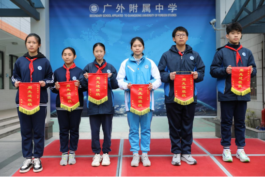 最后,颁发上周流动红旗。获得流动红旗的班级是:初一(1)、初一(4)班,初二(2)、(3)、(4)班,初三(3)班。
