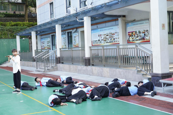 清晨8时,全校师生列队肃立。国旗护卫队迈着铿锵步伐护送五星红旗,在《义勇军进行曲》中,鲜艳的国旗与朝阳同升。全体师生高唱国歌,向先烈致敬。