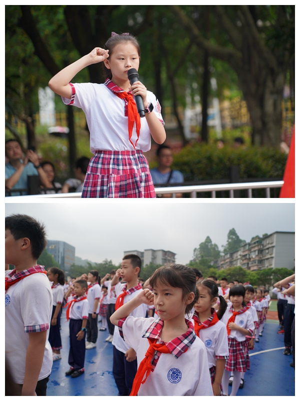 在少先队大队长张舟涵带领下,新队员们纷纷举起右拳大声宣誓,脸上洋溢着自豪和喜悦,嘹亮的誓言在校园久久回荡。