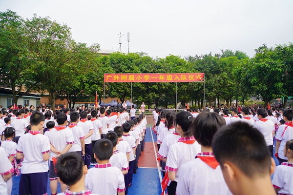 本网讯 5月24日一早,暖暖的阳光普照广外附小的校园,在蓝天白云和红红的队旗的映衬下,校园变得格外迷人。这是个值得纪念的好日子,这一天我们入队啦!你听,队歌激昂;你看,队旗飘扬。我们戴上了鲜艳的红领巾,成为了一名名光荣的少先队员!