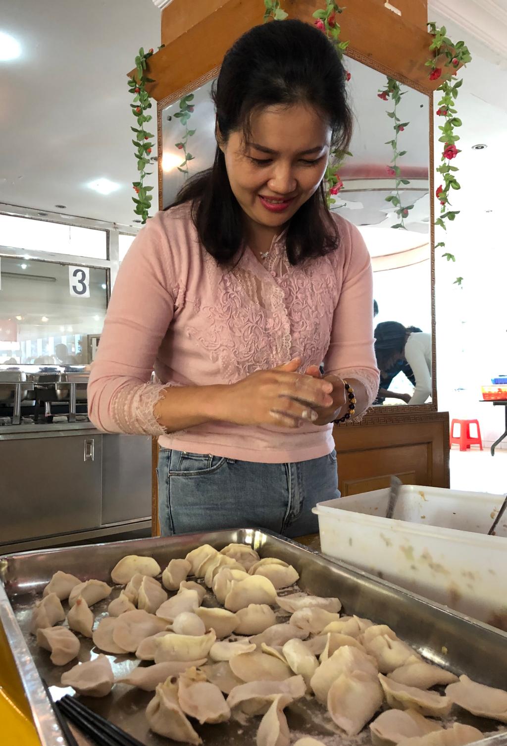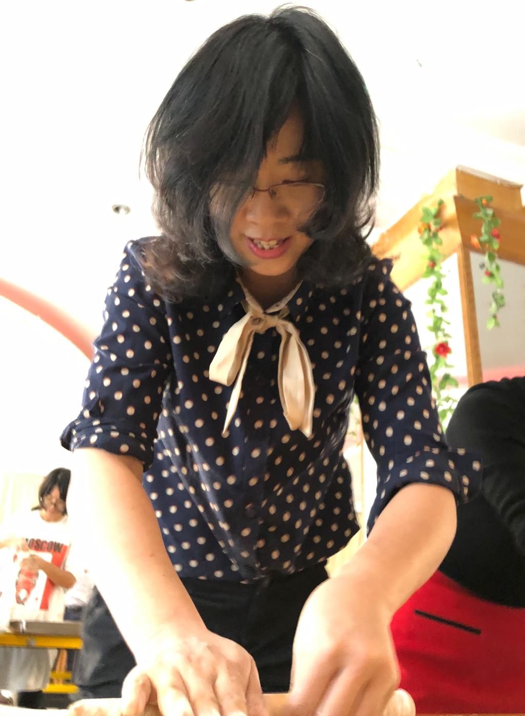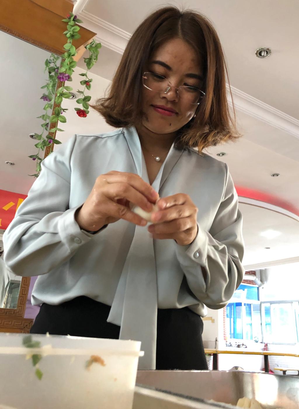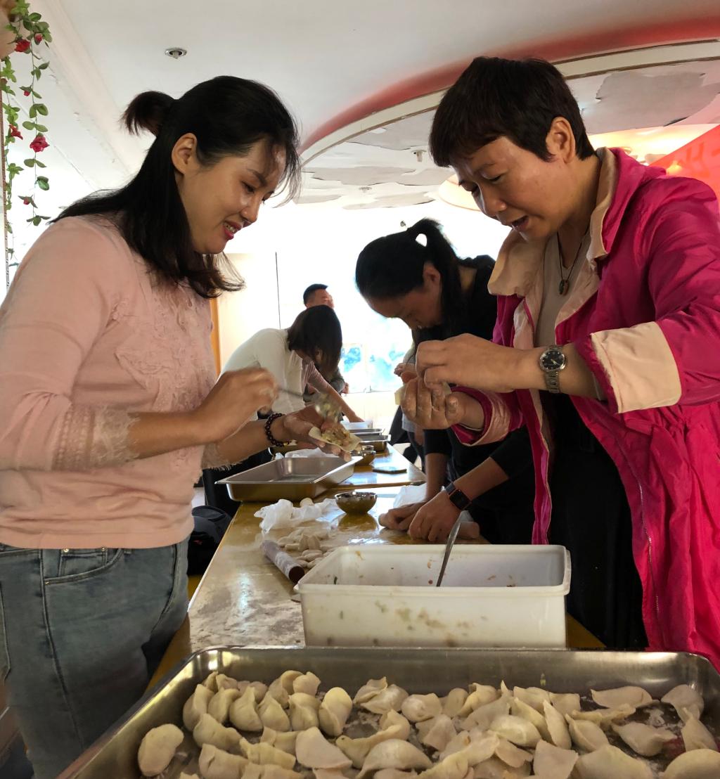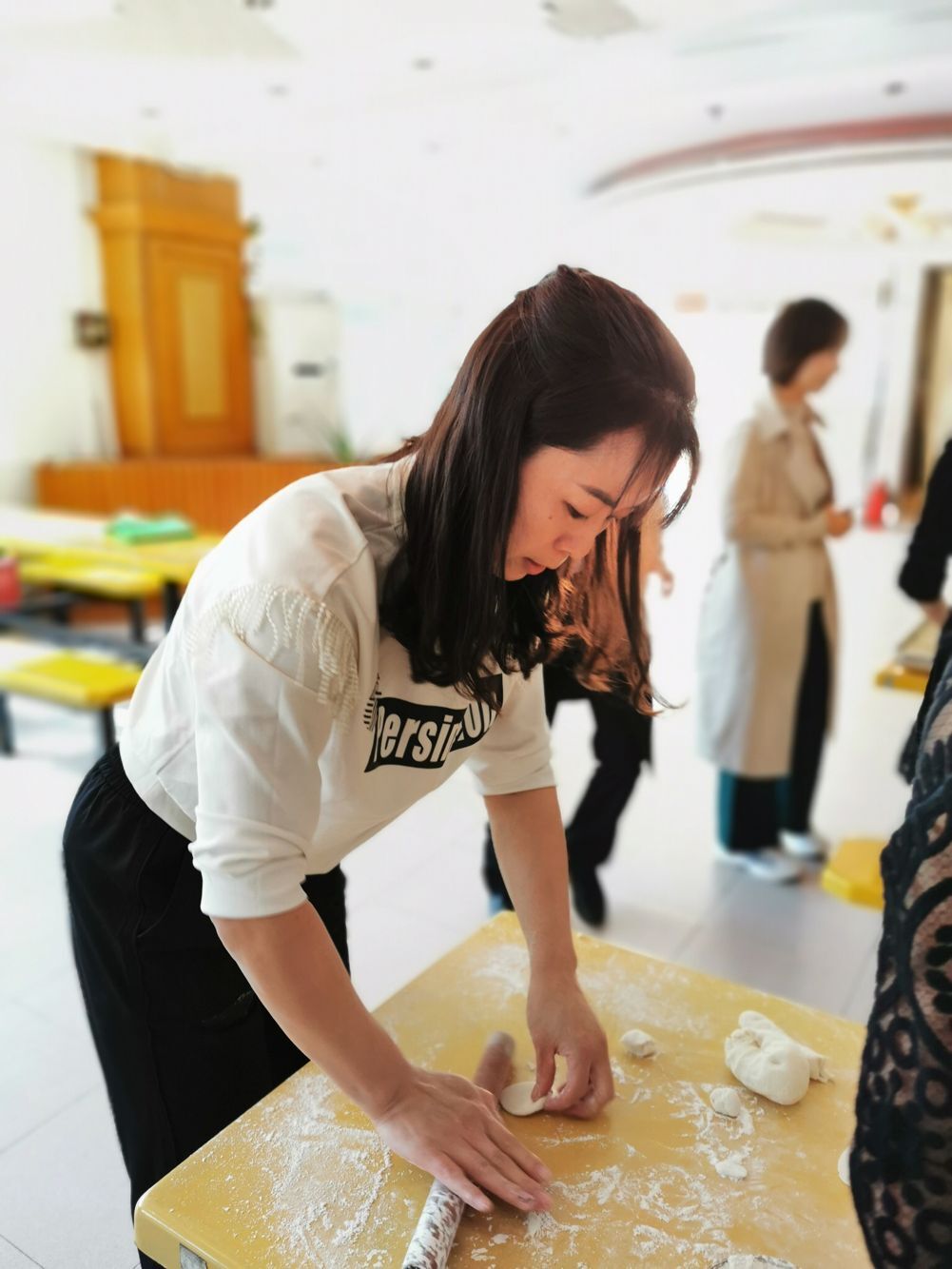 “比赛开始!”听到口令后,老师们迅速开始分工合作。和面的老师左右开弓、手筋十足,不一会儿就掐出小面团;擀面的老师拿着擀面棍熟练地擀好饺子皮;最后一道工序的老师一手拿着饺子皮,一手快速把馅料放入皮内,然后在边缘处抹上少量的水,从右边开始一直向右捏出褶皱,很快半月形饺子便做好了。
