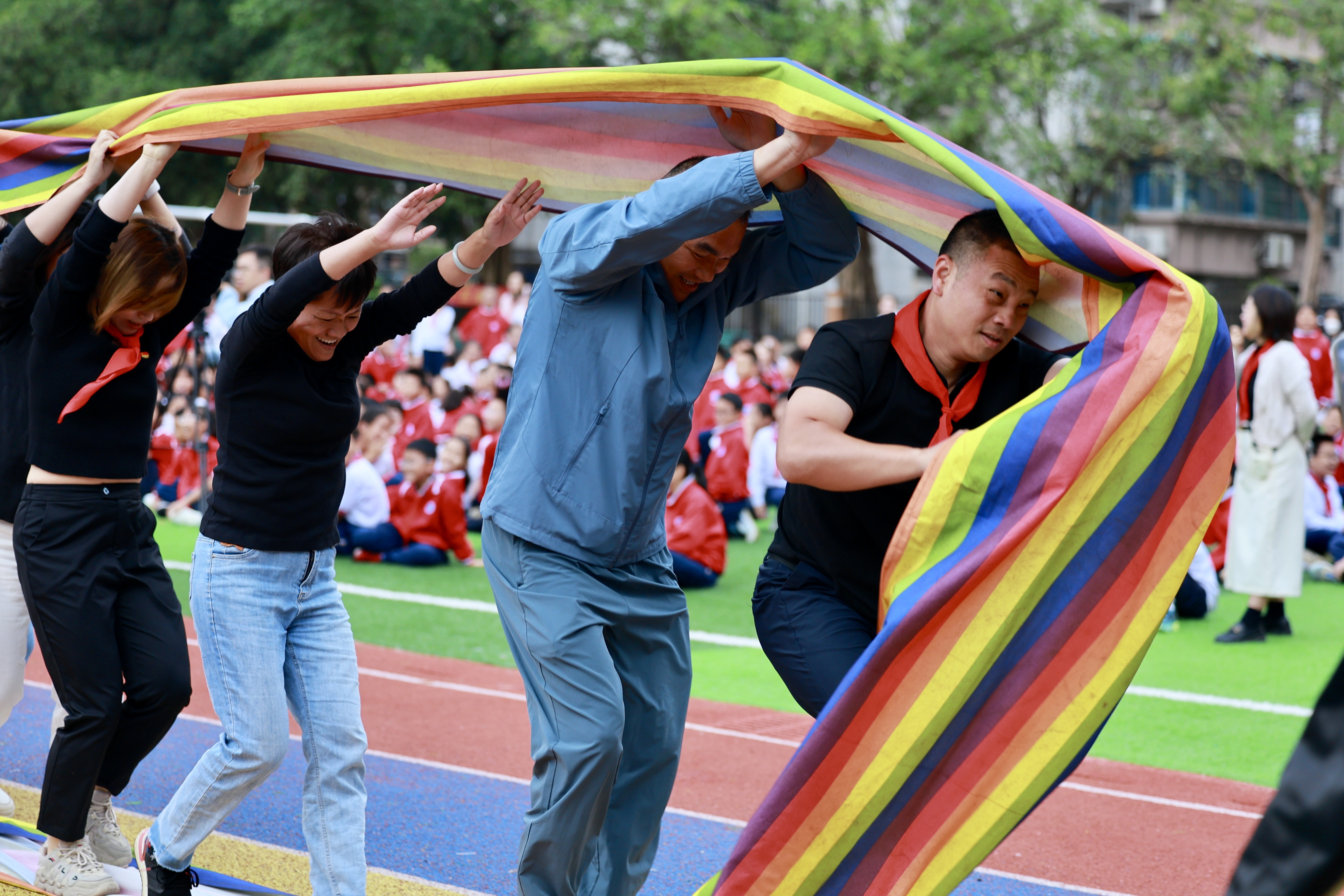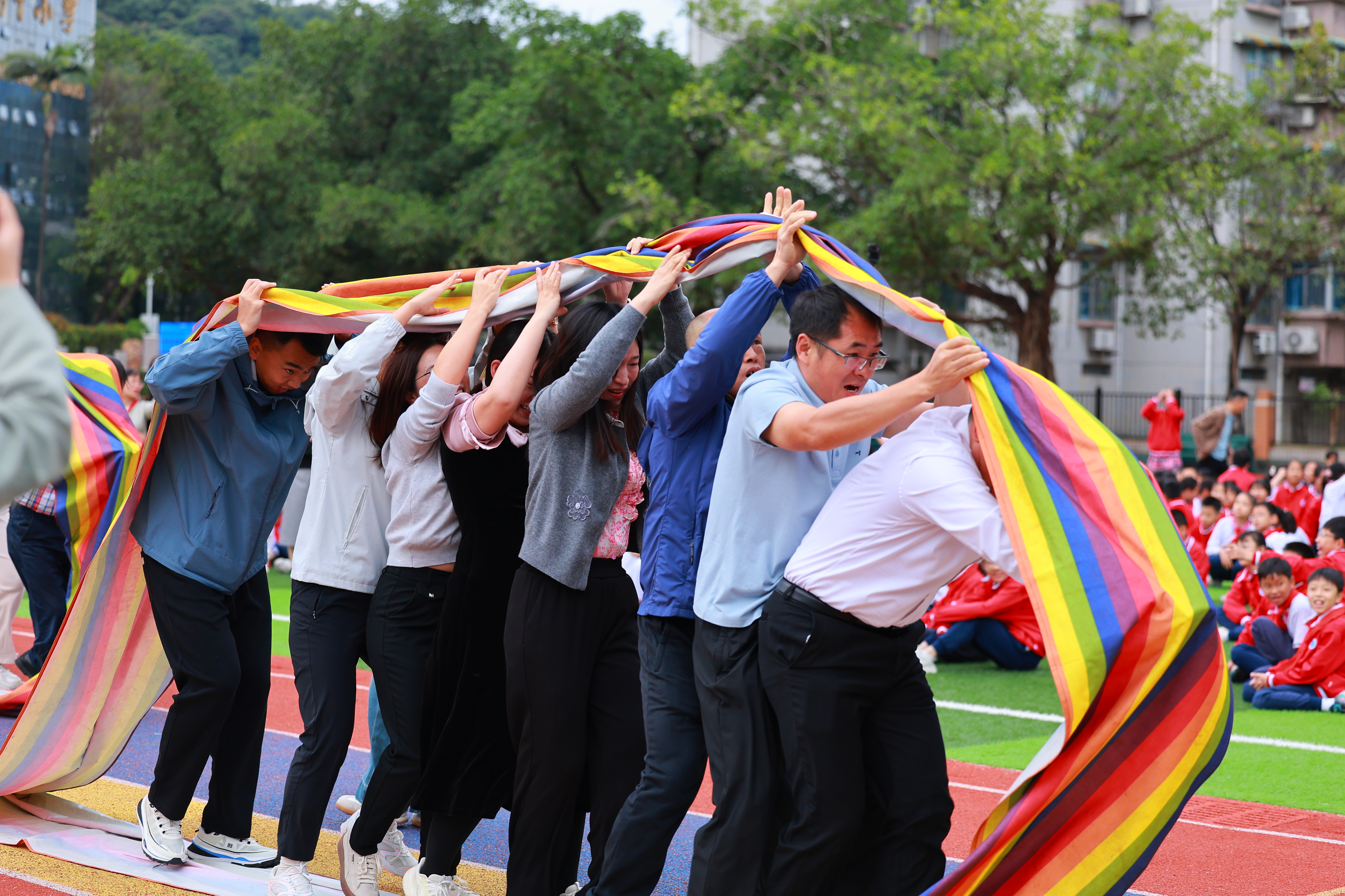 五年级组展现出卓越的团队配合,步伐一致、节奏流畅,宛若施展“同步魔法”,以明显优势摘得桂冠。行政后勤组稳扎稳打,配合默契,从众多强队中脱颖而出,荣获第二名,展现出后勤团队在赛场上的别样风采。七年级组在关键时刻稳住阵脚,把握“速度与平衡”的要义,成功实现反超,将第三名收入囊中,赢得现场阵阵掌声。