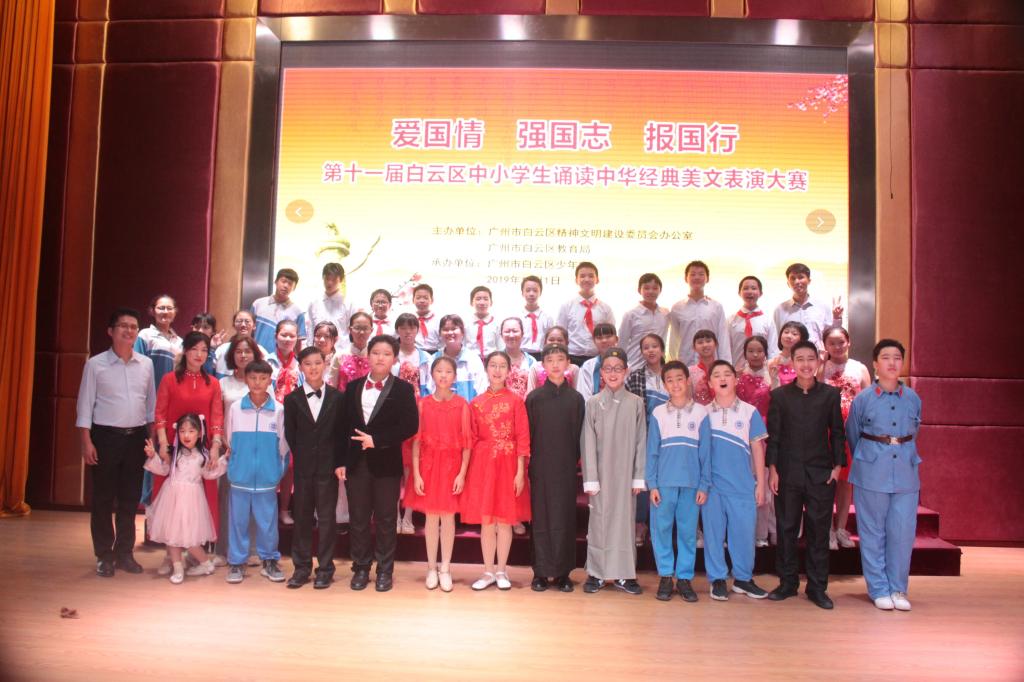 本网讯 11月1日下午,初一4班全体同学在王琪、张柳老师的带领下赴白云区少年宫参加第十一届白云区中小学生诵读中华经典美文表演大赛。经过激烈的角逐,我们获得了第五名的好成绩。