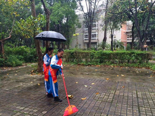 几位同学在居委会工作人员的带领下,开始了志愿工作。大家不怕淋雨,发扬着不怕苦不怕累的雷锋精神,清理墙上的小广告,捡拾草丛和人行路上的垃圾。雨打在同学们的脸上,手上,但没有一人曾经抱怨,很快地,同学们的任务完成了。拿着钳子,铲子的同学们手已有些酸痛,但真实地感受到志愿工作带来的愉悦。