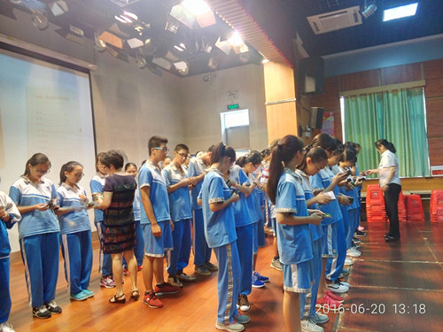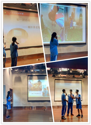 在庄严的国歌声中,入团仪式正式开始。活动开始,是由各个支部对入团月主题团日活动的展示,初二1班支部的社区活动、初二3班支部的图书馆义工活动和初一年级支部联合举行的颐年养老院义工活动,各个支部负责人通过ppt和小剧向各位老师和同学展现了个富特色的主题团日活动。