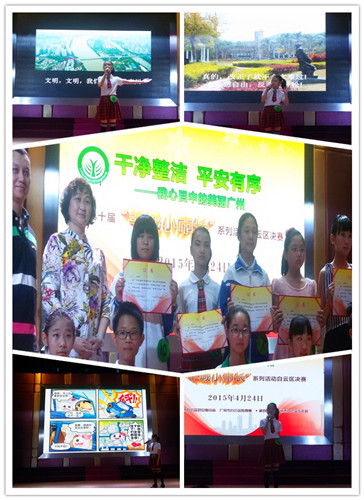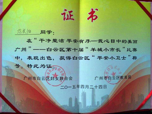 本网讯4月24日下午,广州市第十届“羊城小市长”比赛白云区决赛在白云区少年宫举行。我校初一1班范美怡同学作为新市片初中生选手参与比赛,比赛共分为:现场演说、看漫画讲故事、特长展示三个环节,经过三轮厮杀,范美怡同学获得了“平安小卫士”的称号。