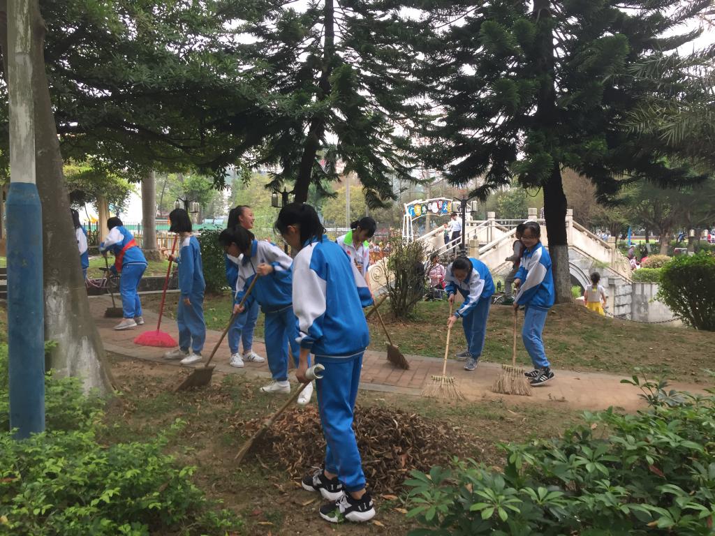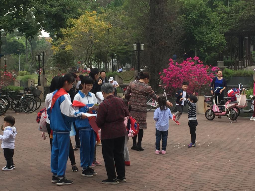 春风和煦、木棉花开。3月7日下午活动课,校团委结合我校实际组织全体中学生干部开展学雷锋进社区志愿服务。一下课,我们一起来到广外幼儿园门口附近开展活动。我们分成两个小队,其中第一小队在幼儿园门口开展禁毒、防蚊、环保的宣传,第二小队在清雅园、沿河小公园附近开展卫生死角清理工作。