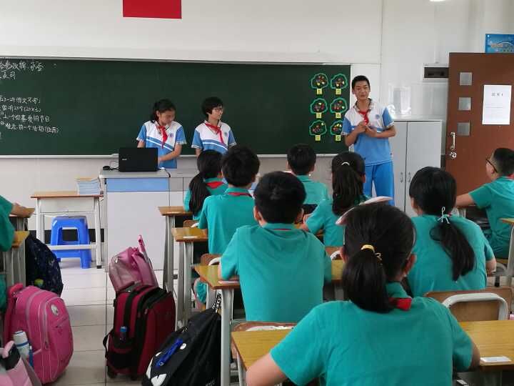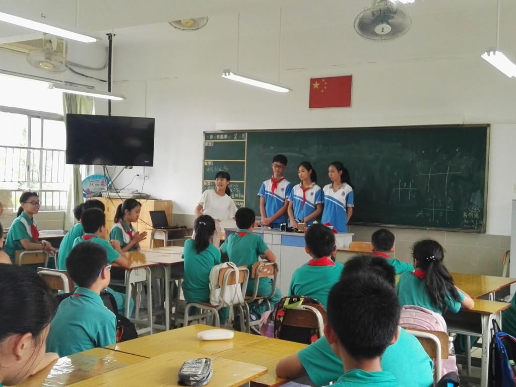 一进教室里,我们就受到了老师和同学们的热烈欢迎。六年级总共有3个班级,我们每3个人教一个班级。首先,我们先和他们做自我介绍,与他们宣传了我们广外附中,然后与他们热烈的和他们讲述了小升初的知识还有谈论了初中生活是怎么样的这个话题。每个同学都很热情,更促使我们这堂课讲得十分的精彩。